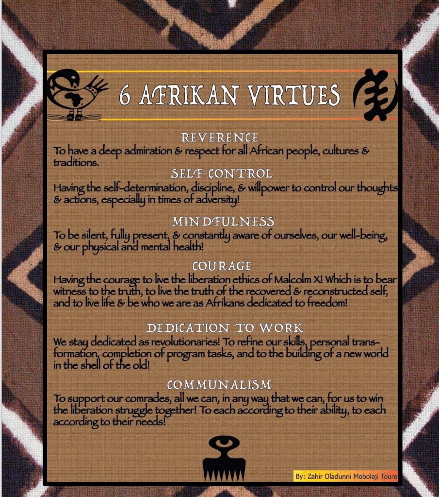 The following list does not utilize all of the 6 Afrikan Virtues but only a few that are most relevant to the principles of Black August. That said, the reader can apply any virtues as they see fit. Also, at the end of each principle, there are recommendations as to how one can practice each virtue. However, be mindful of yourself. Try to push past your former boundaries but do not engage in activities that could hurt yourself or others.